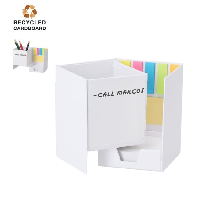 Lapicero Portanotas Pizarra fabricado con cartón reciclado. Es un práctico cubo desplegable con 170 hojas de 7×7 cm y 125 mininotas adhesivas de 3,8x 1,2cm en variados colores, 25 mininotas de 7,5 x 3,5 cm con práctico hueco para usar como lapicero. Lado frontal con función pizarra.