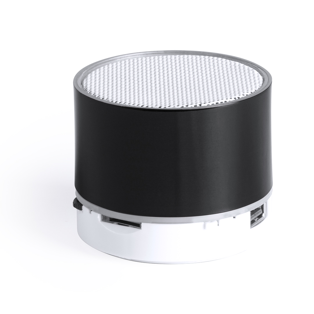 Compacto altavoz de conexión Bluetooth® con interior iluminado. Superficie exterior especialmente diseñada para marcaje en láser y así iluminar el logotipo marcado. De diseño bicolor con suave acabado y conexión Bluetooth® 3.0, ofrece 3W de potencia, tiene función de manos libres, una ranura para tarjetas micro SD de hasta 32 GB de capacidad, función radio FM, entrada auxiliar de línea mediante conexión jack de 3,5mm y soportes de goma antideslizantes en la base. Compatible con iOS y Android, incluye cable de carga mini USB, cable auxiliar jack de 3,5mm y viene presentado en atractiva caja de diseño. Con base antideslizante.