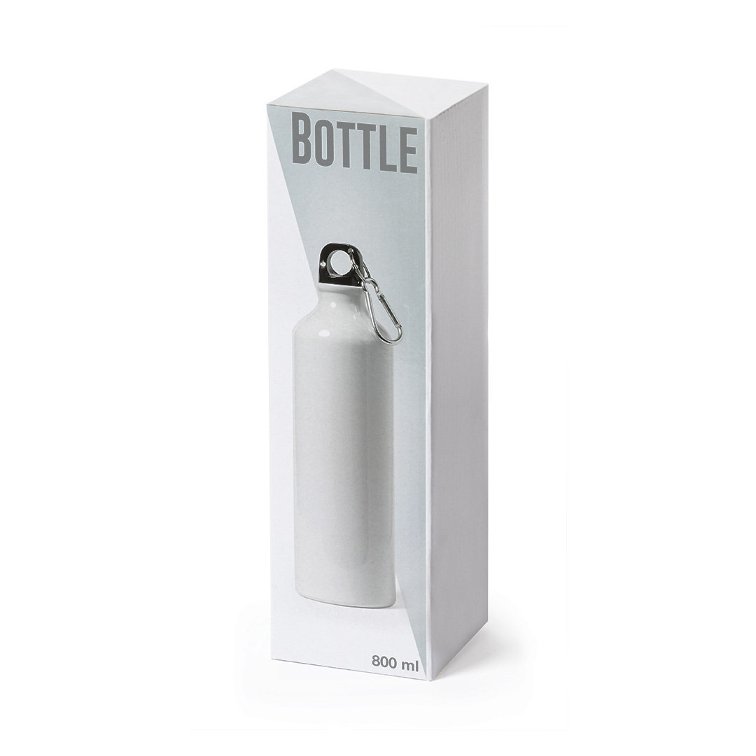 Bidón de aluminio de 800ml de capacidad. Acabado en suave y brillante color blanco, especialmente diseñado para marcaje en sublimación. Con tapón de seguridad a rosca y mosquetón metálico de transporte. Presentado en atractiva caja de diseño.