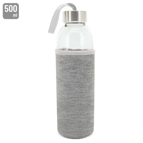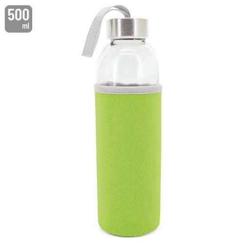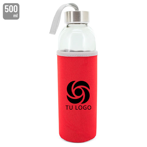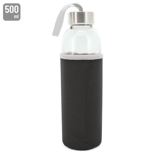 Bidón de cristal de 500ml con funda neopreno antideslizante y desmontable. Disponible en una amplia gama de colores. Botella presentada en caja.