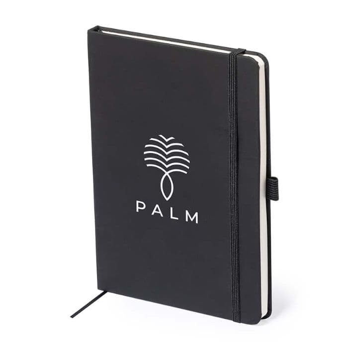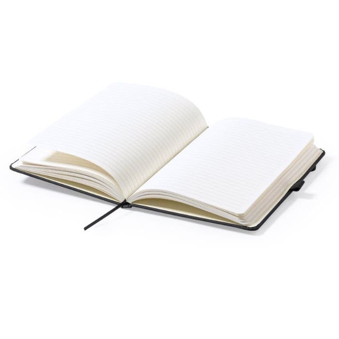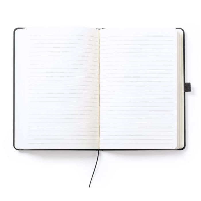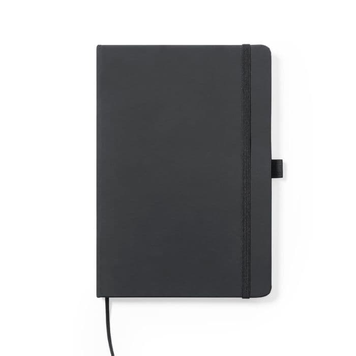 Bloc de notas A5 fabricado en polipiel de elegante acabado en negro. Con tapas duras, marcapáginas y elástico de sujeción a juego. Interior con 100 hojas de disposición a 1 raya y soporte para bolígrafo (bolígrafo no incluido).