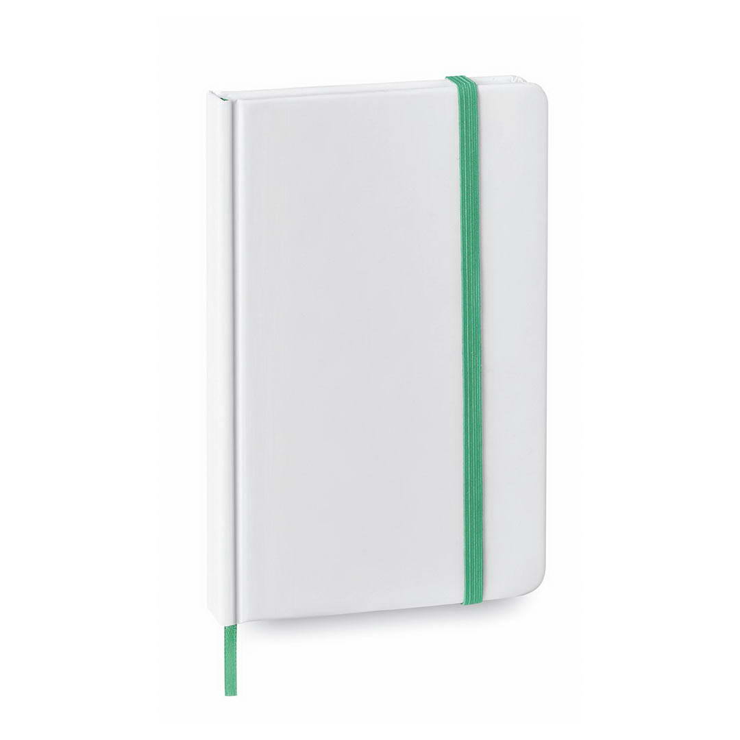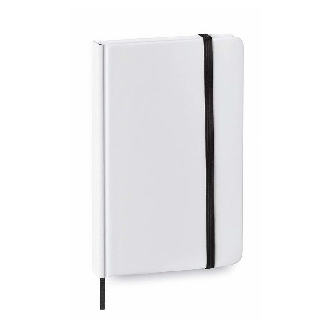 Bloc de notas con tapas de suave tacto acabadas en resistente cartón de elegante acabado en blanco. Especialmente diseñado para marcaje digital en tapas, cuenta con 80 hojas lisas además de elástico de sujeción y marcapáginas de tela a juego.