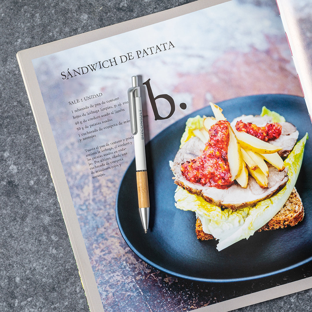 Este exquisito bolígrafo personalizado fusiona la elegancia atemporal con la responsabilidad ecológica, incorporando un mecanismo pulsador.