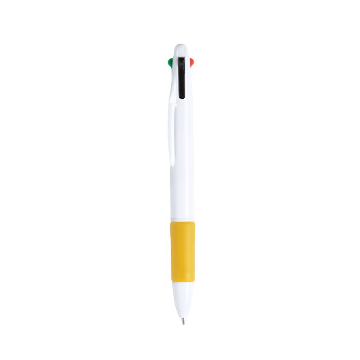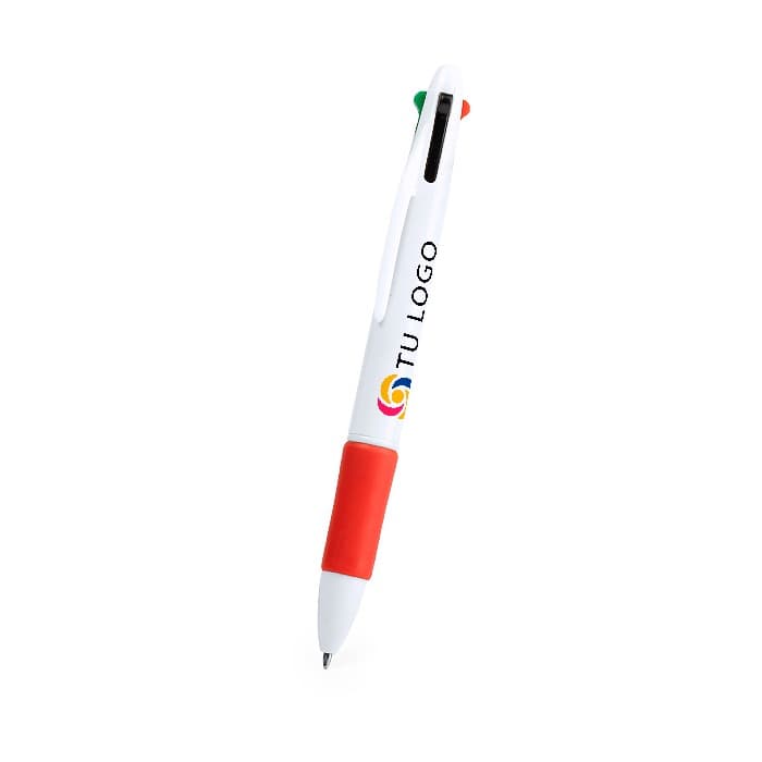 Bolígrafo 4 en 1 de mecanismo pulsador retráctil, de clásico diseño y cuerpo de suave acabado sólido en color blanco. Suave empuñadura a juego en vivos colores. De 4 cartuchos, en tintas azul, negra, roja y verde.