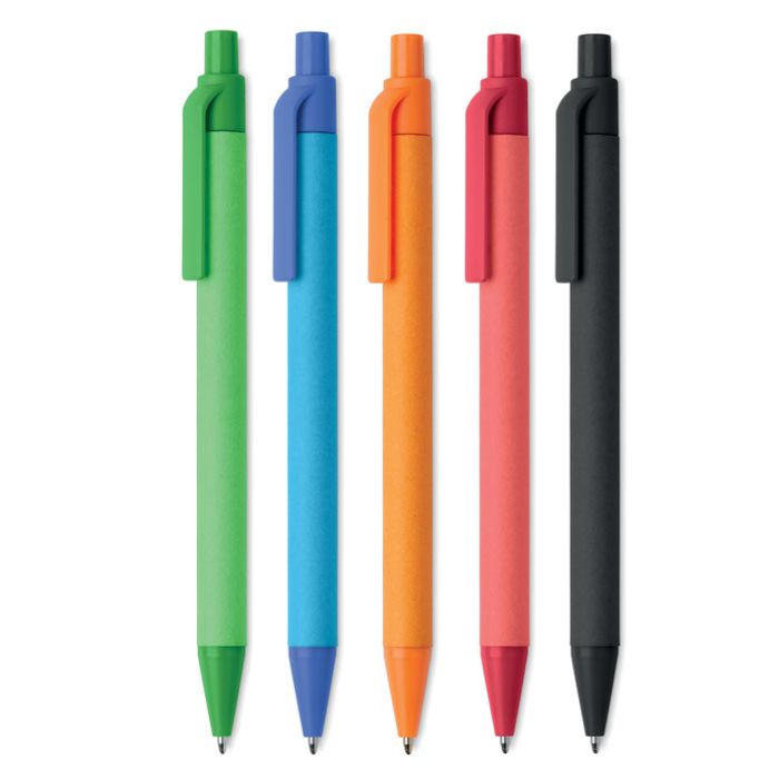 Bolígrafo de pulsador con cuerpo de papel. Clip y punta hechas de 100% de almidón de maíz PLA. Tinta azul.