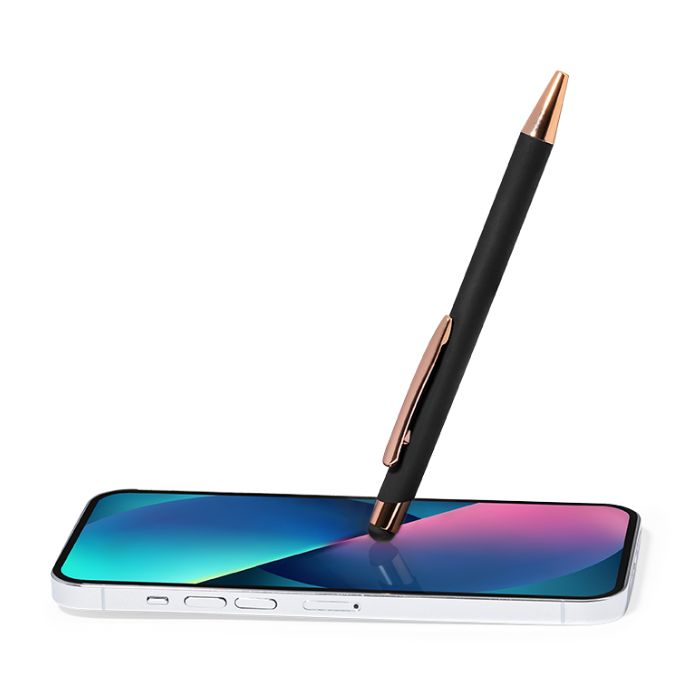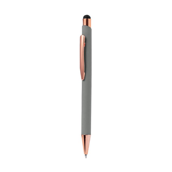 Bolígrafo puntero de tacto goma especialmente diseñado para grabar a láser con tu logotipo en un color dorado rosado. Un bolígrafo elegante y original que encantará a todo el que lo reciba como regalo.