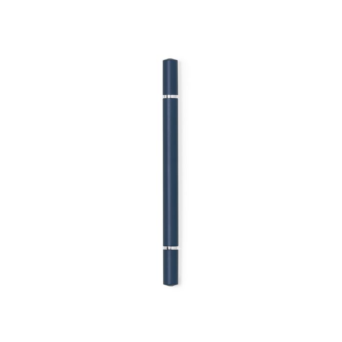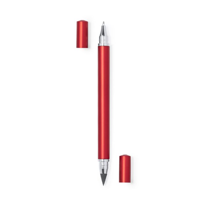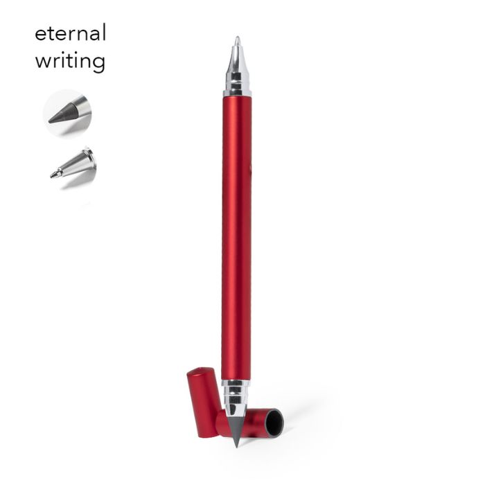 Bolígrafo con lápiz eterno. Un bolígrafo 2 en 1 con cierre de capucha. En un extremo tendrás un bolígrafo de tinta azul y carga jumbo. Y un lápiz eterno en el otro extremo. Así usarás siempre el mismo lápiz y no generarás residuos, gracias a que no hay que sacarle punta. Cuerpo en resistente ABS de acabado metalizado.