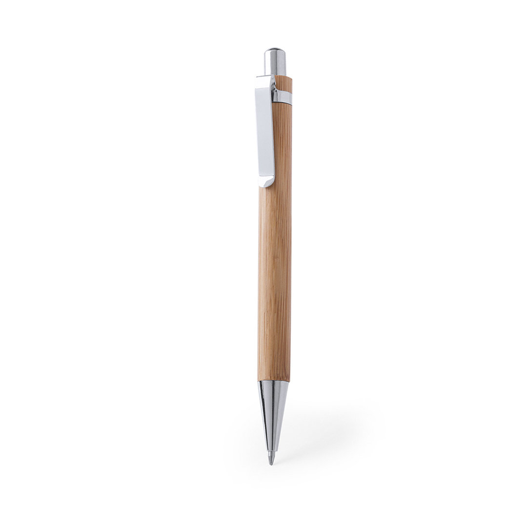 Elegante bolígrafo de mecanismo pulsador con cuerpo en madera de bambú natural y accesorios de acabado metálico en color plateado brillante. De cartucho jumbo y tinta azul.