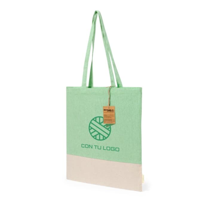 Bolsa de 100% algodón reciclado y 120 g/m2. Tiene asas largas con refuerzo de 70cm y acabado cosido. La bolsa cuenta con el logotipo de reciclado en la etiqueta latera. Tiene una resistencia de hasta 8 kg de peso. Disponible en variada gama de colores nature con base de color natural.