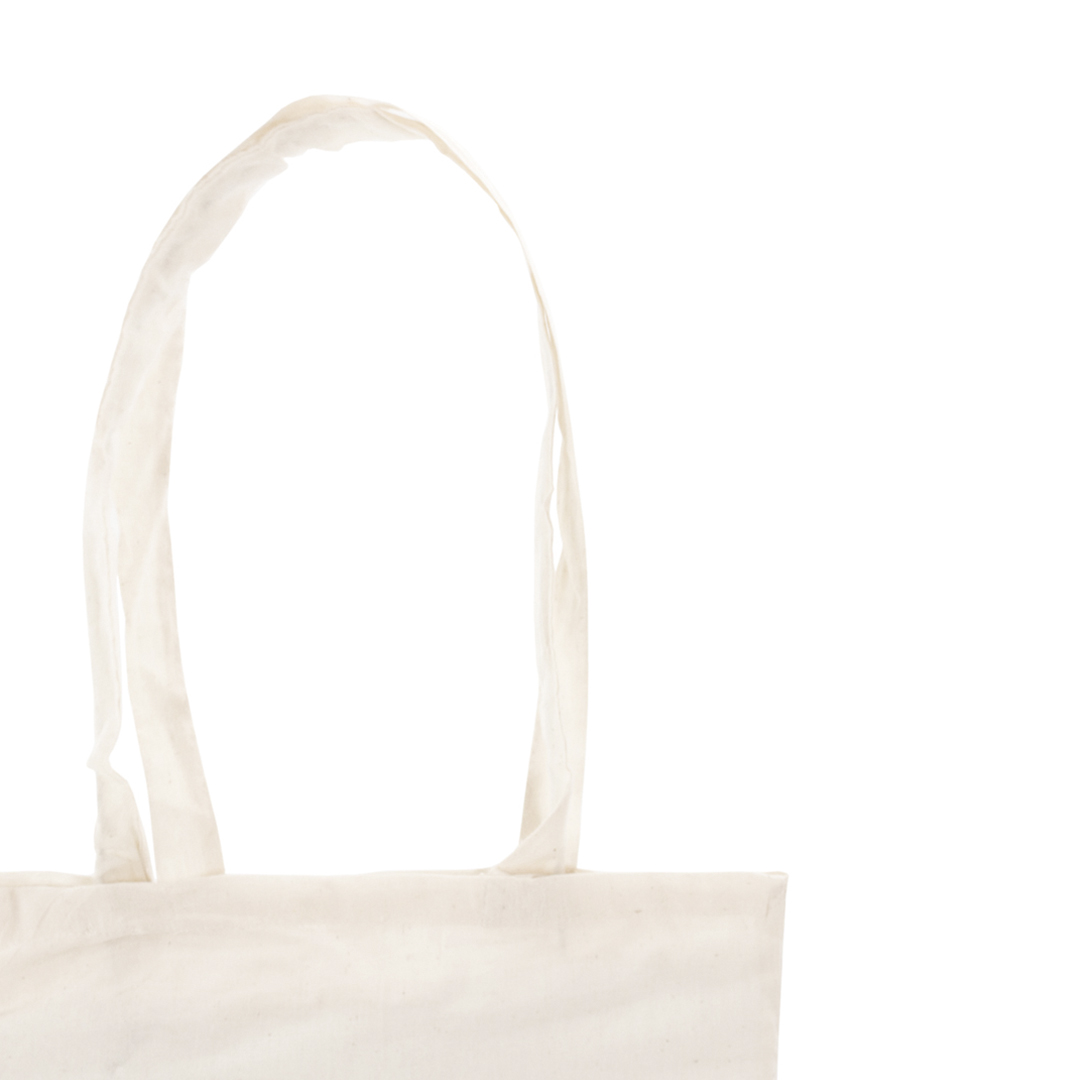 Bolsa de algodón en color natural. La típica bolsa 100% de algodón, con un gramaje de 105gm. Una bolsa ligera, pero con una resistencia de hasta 7kg de peso. Con asas largas de 70cm y acabado cosido.