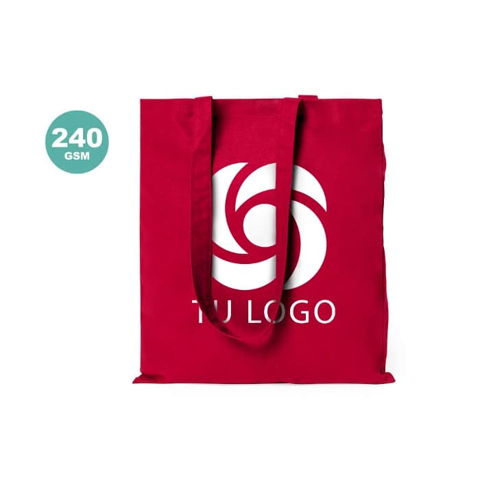 Bolsa fabricada en algodón 100% de 240g/m2. De acabado cosido y asas largas reforzadas (70 x 2,5 cm). Disponible en variada gama de colores. Resistencia hasta 10 kg de peso.