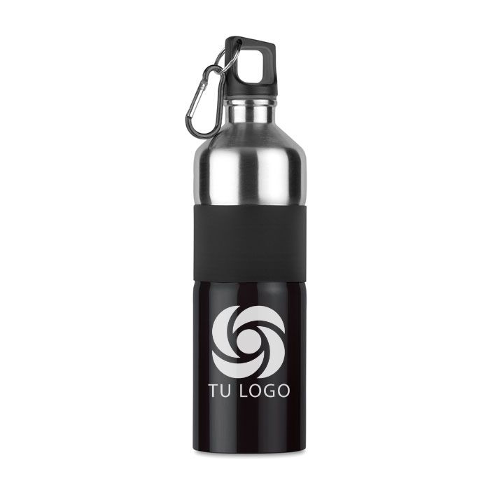 Botella de acero inoxidable bicolor de pared simple con empuñadura de goma y mosquetón. Capacidad: 750 ml. El mosquetón no es para escalar (uso no profesional). Anti fugas.