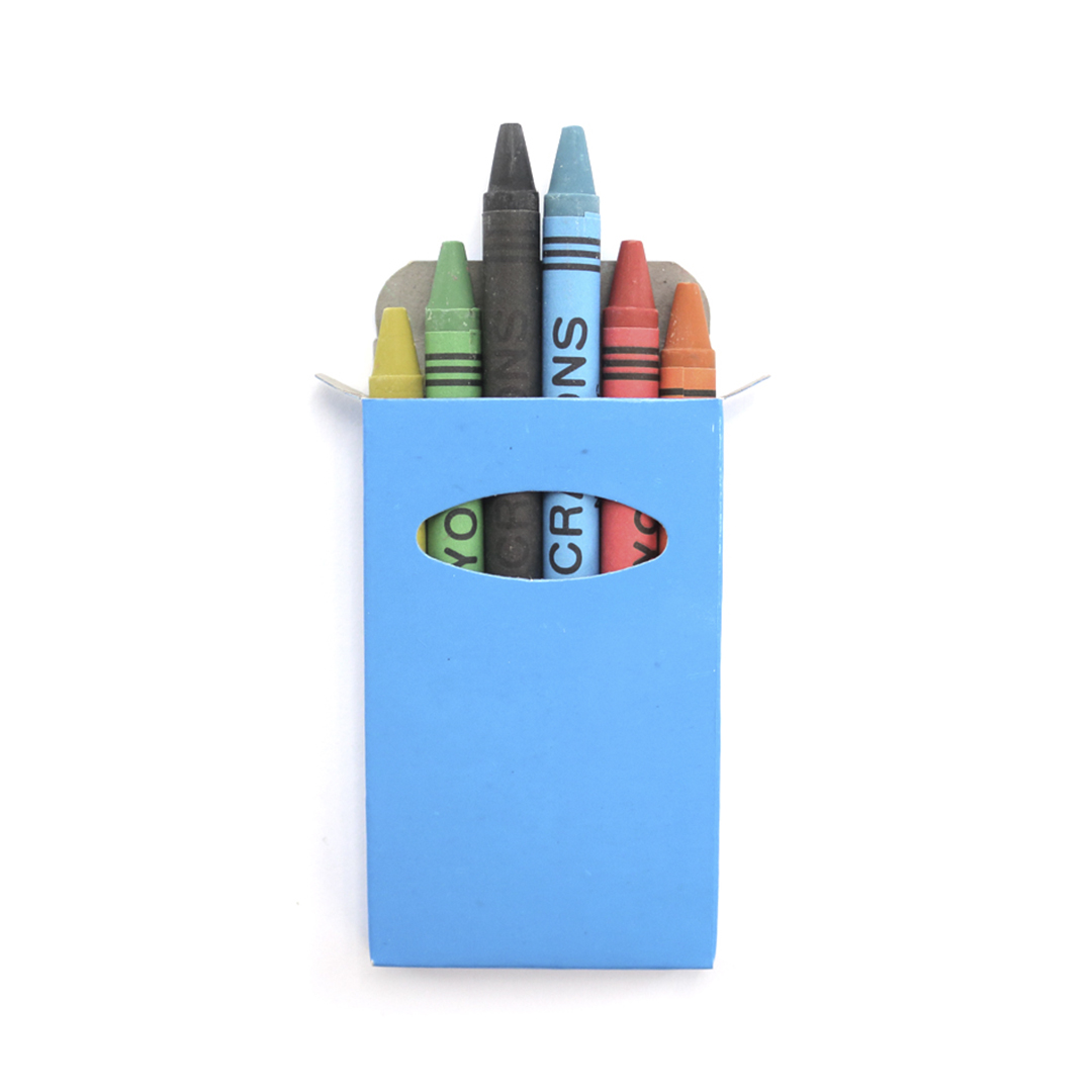 Set de 6 ceras en caja de cartón con acabado brillante en vivos colores y ventana. Con cuerpo cilíndrico en variados colores. En colores rojo, verde, amarillo, azul, negro, y naranja.