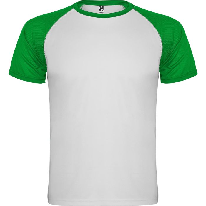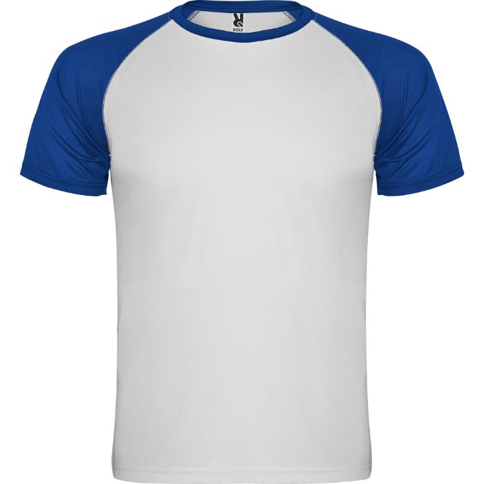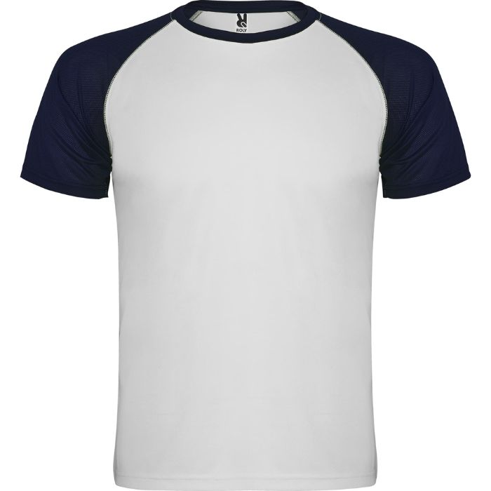 Camiseta deportiva de manga corta estilo ranglán en contraste. Cuello redondo en contraste con cubrecosturas de refuerzo.