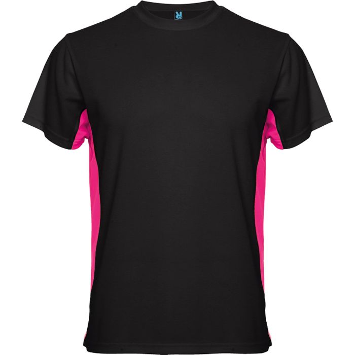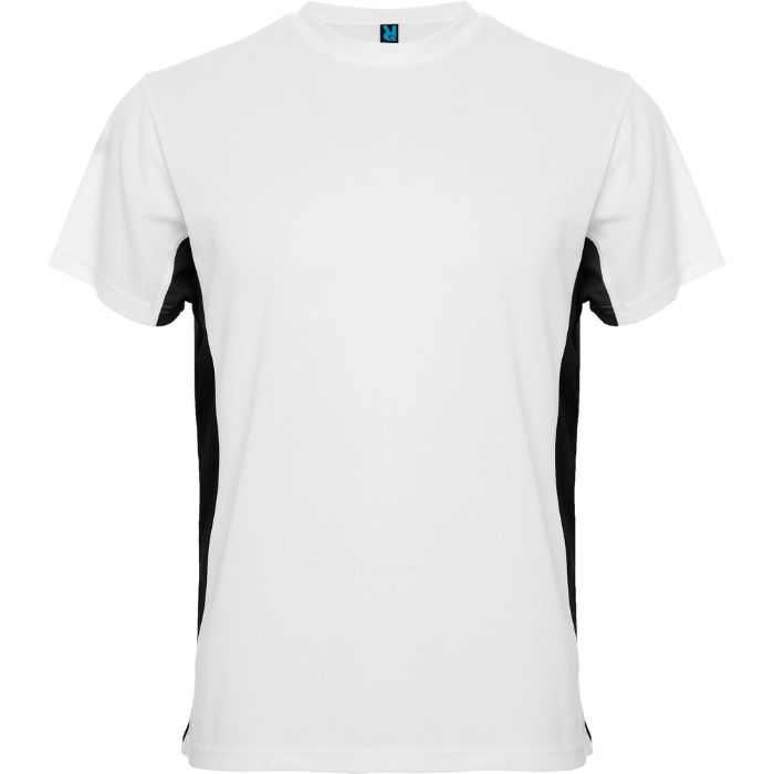 Camiseta técnica de manga corta transpirable. Cuello redondo con cubre costuras a tono. Tejido de fácil secado. Combinación de colores, paneles laterales a contraste.