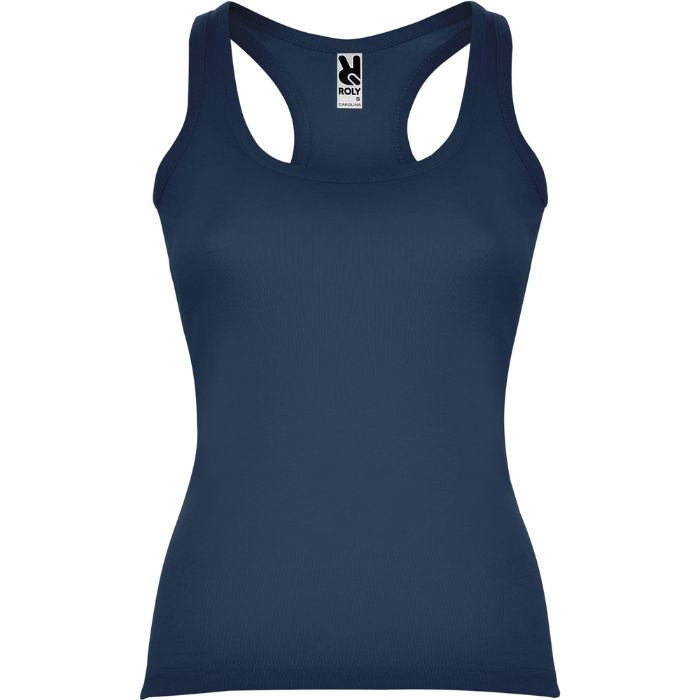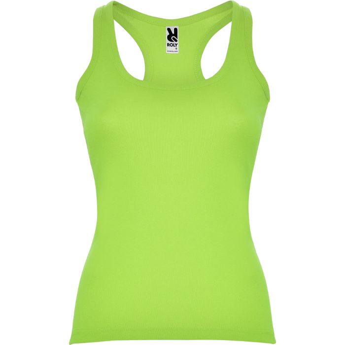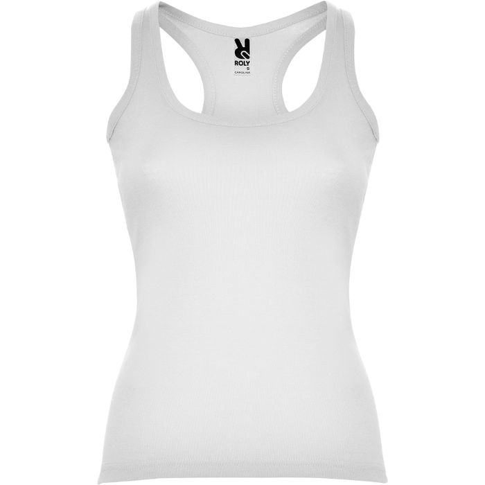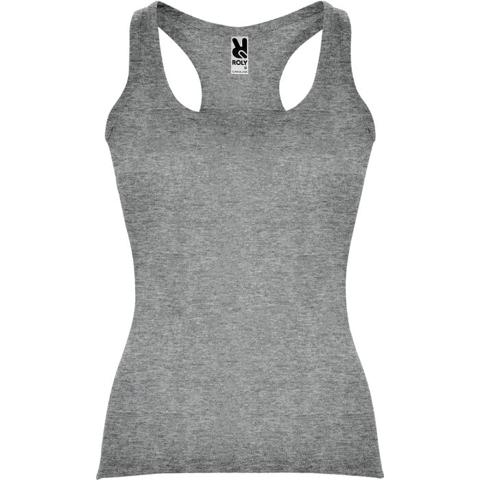Camiseta entallada, con sisas y escote ribeteado, ancho y enrollado. Espalda estilo nadadora y costuras laterales.