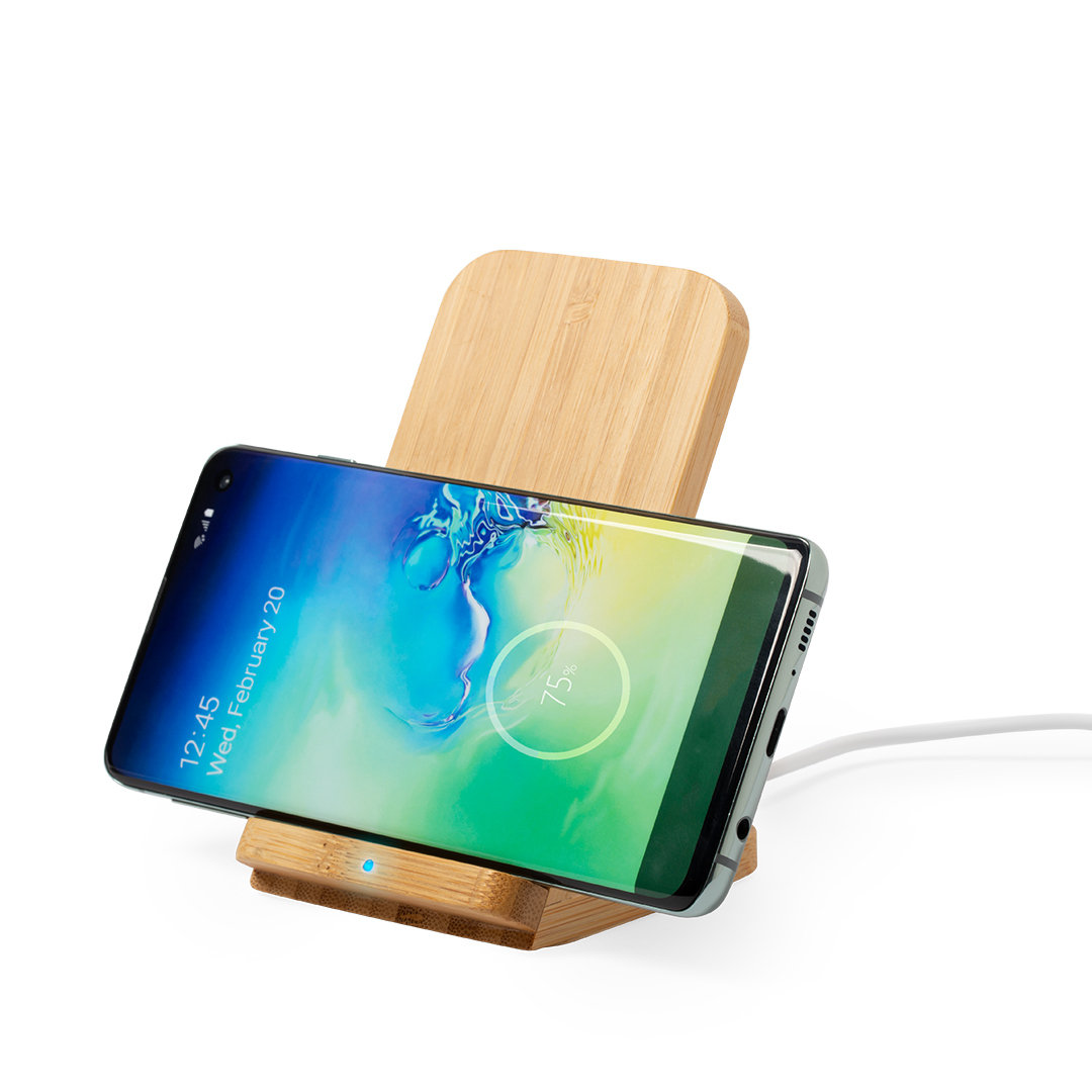 Cargador inalámbrico de línea nature con función soporte para smartphone. Hecho en bambú procedente de cortes naturales. Indicador de estado de carga y compatible con dispositivos equipados con tecnología de carga inalámbrica. Amplia superficie de marcaje y presentado en atractiva caja de diseño eco.