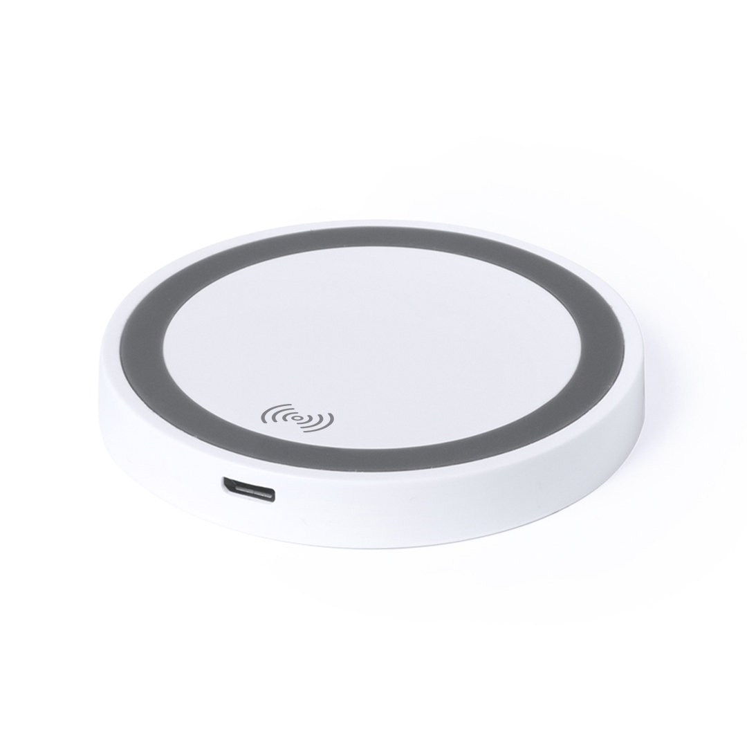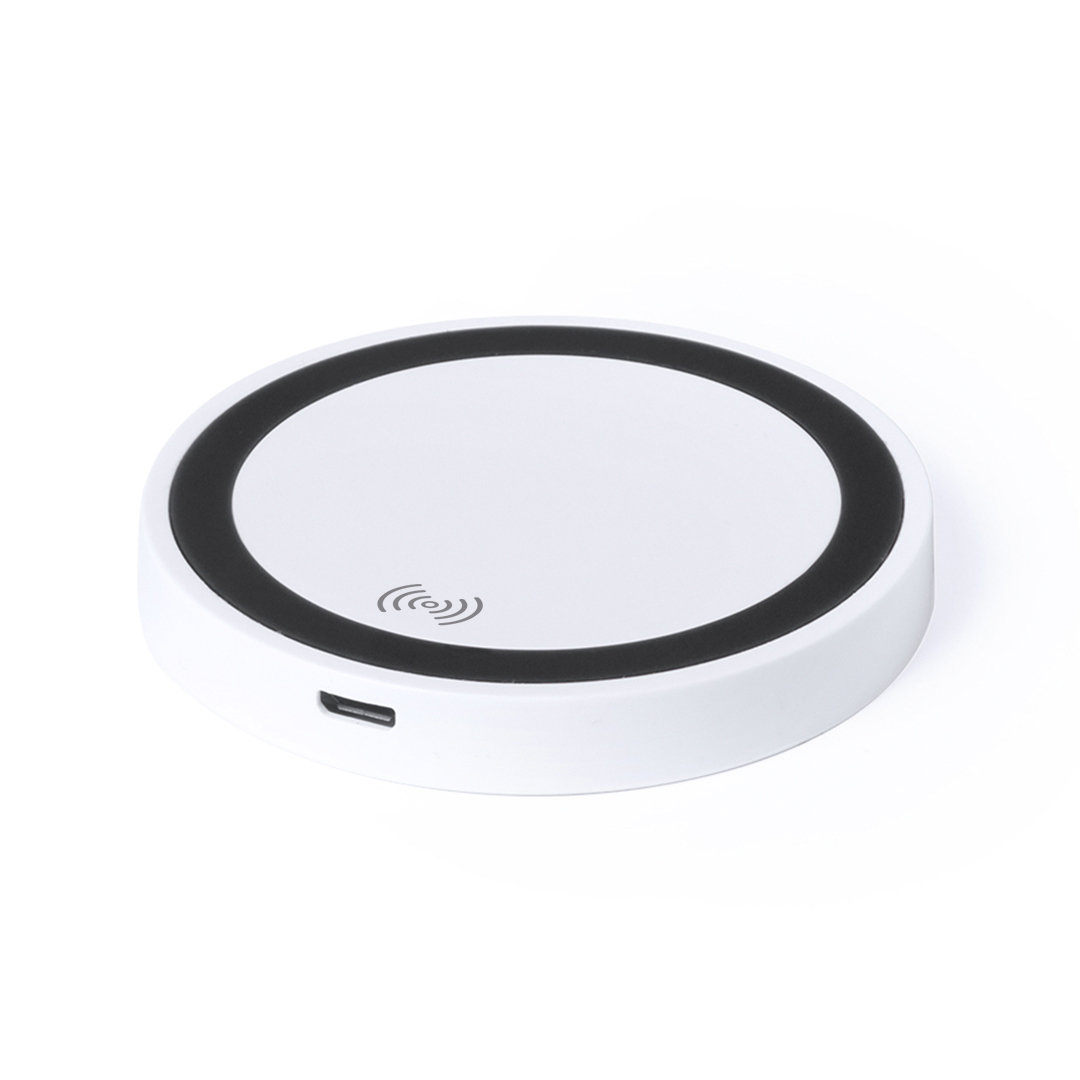 Cargador inalámbrico circular de diseño bicolor. Con base antideslizante e indicador LED de estado de carga. Compatible con smartphones con tecnología de carga inalámbrica y presentado en atractiva caja de diseño.