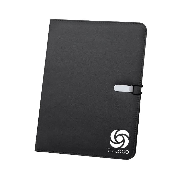 Elegante carpeta en vivos colores acabada en suave microfibra, con cierre metálico de elástico especialmente diseñado para marcaje en láser. Interior con bloc extraíble de 20 hojas lisas, 3 bolsillos de solapa, tarjeteros y soporte para bolígrafo.