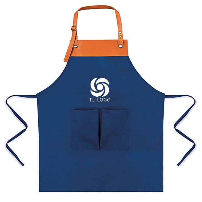 Delantal con doble bolsillo y cinta ajustable, presentado en bolsa individual. Este delantal es de tela, con la parte superior de imitación al cuero, y una cinta en el cuello que puedes ajustar.