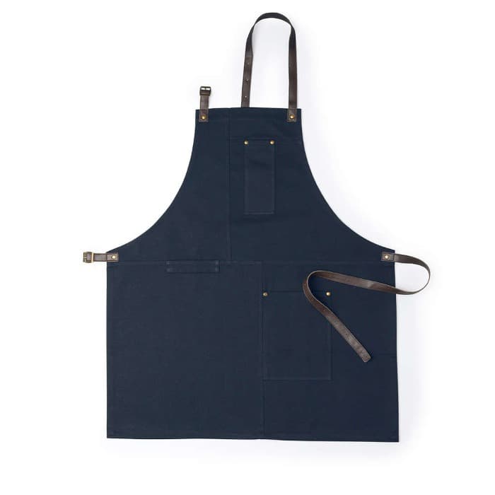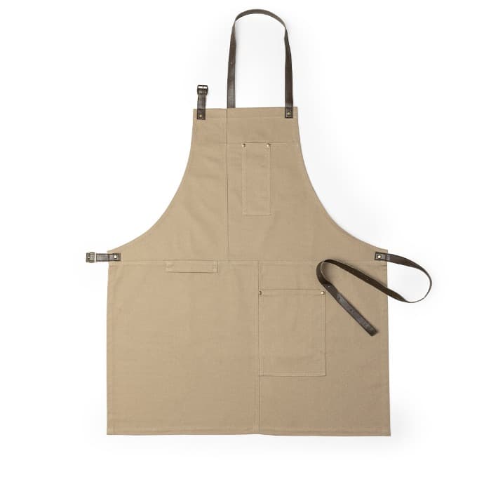 Delantal pro de alta calidad en resistente material 100% algodón canvas de 340g/m2. De corte por debajo de la rodilla, con cintas de cuello y cintura en resistente polipiel con ajuste mediante hebilla y reforzado con remaches metálicos. Incluye multitud de bolsillos para los distintos utensilios, con las costuras reforzadas.