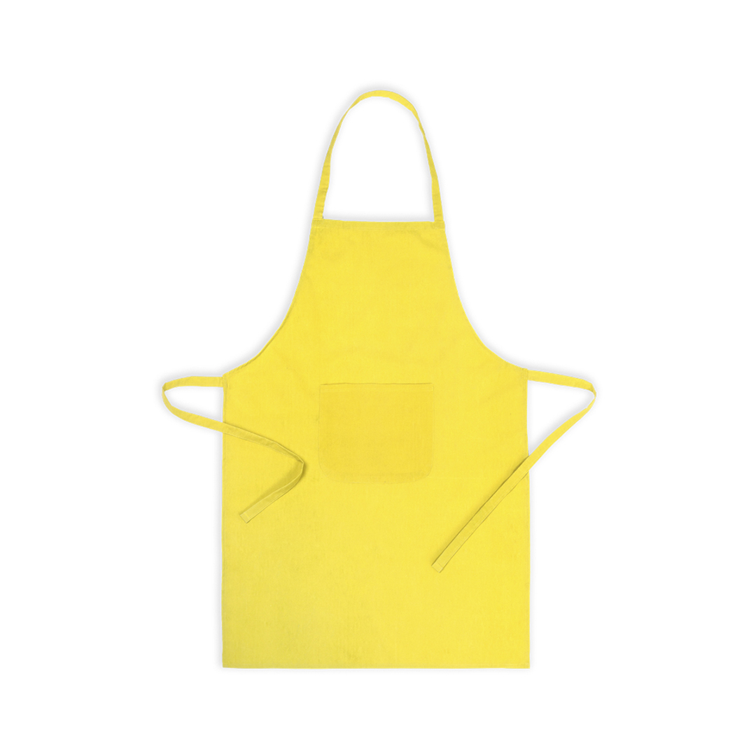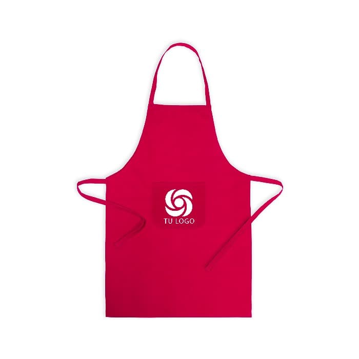 Delantal en material TC -combinado de algodón y poliéster-. En variada gama de vivos colores, con bolsillo frontal y cintas de ajuste. De corte por debajo de la rodilla.