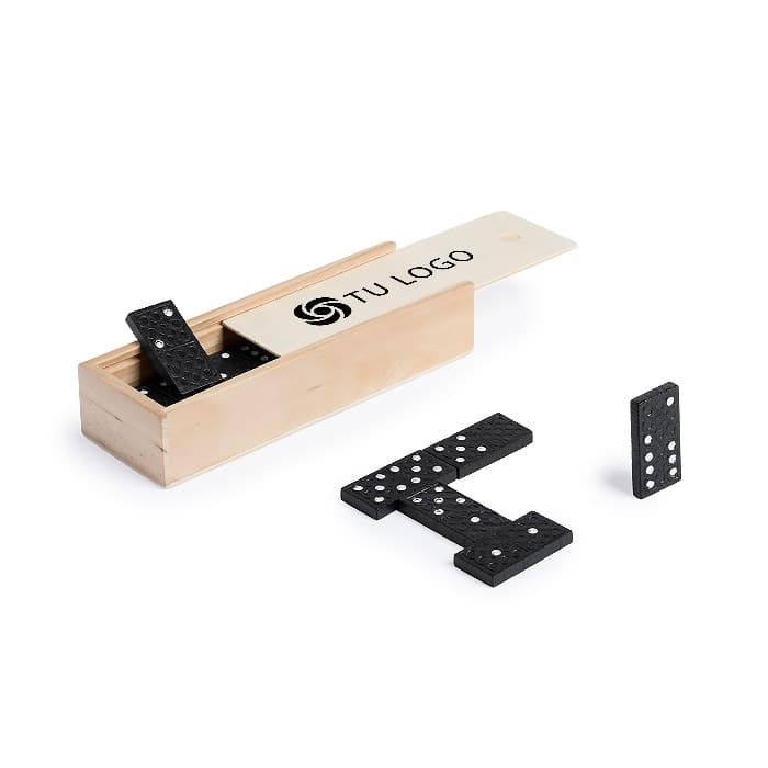 Dominó clásico de 28 piezas fabricado en madera. Piezas en sobrio diseño de color negro con detalle en blanco. Presentado en estuche individual de madera con tapa.