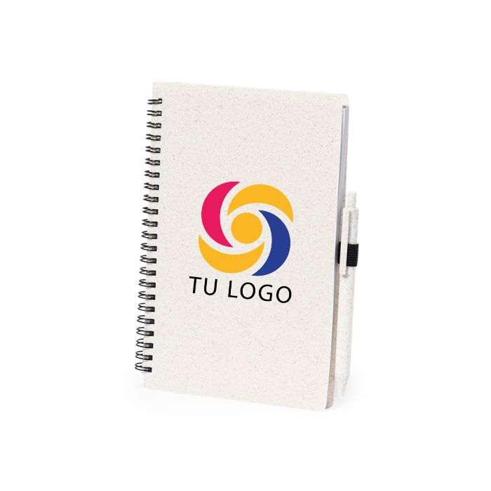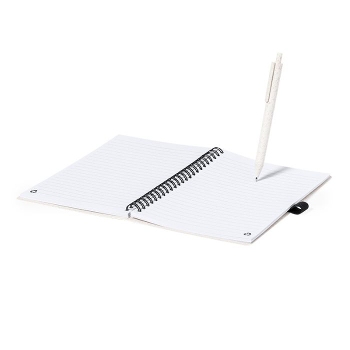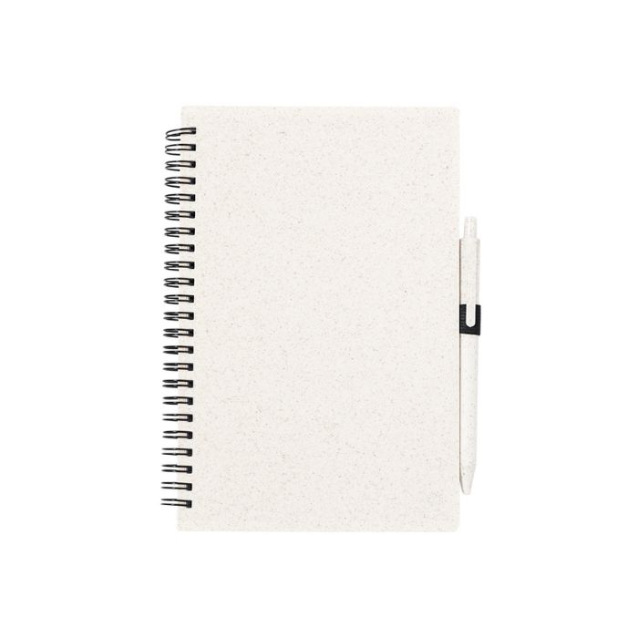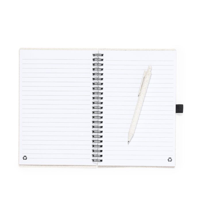 Libreta de anillas con tapas duras en caña de trigo y soporte para el bolígrafo. De 80 hojas con diseño eco y disposición a una raya.