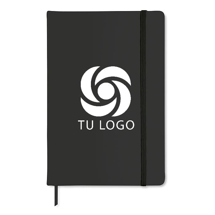Libreta A5 con tapa rígida de PU de tacto suave. 96 hojas lisas. Banda elástica y marca páginas.