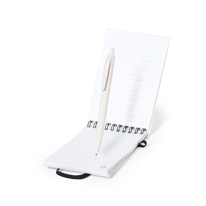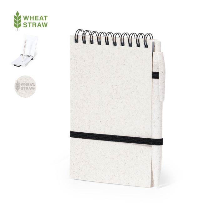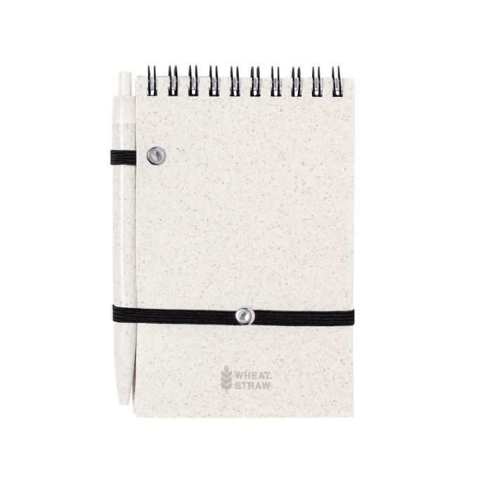 Bloc de notas de anillas con tapas de caña de trigo y con un bolígrafo a juego, fabricado también en caña de trigo.