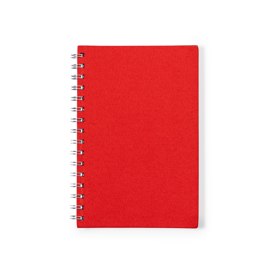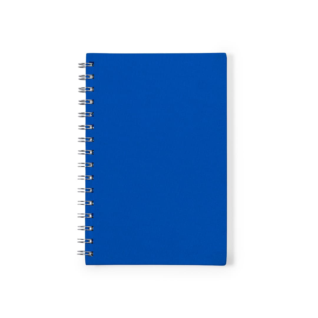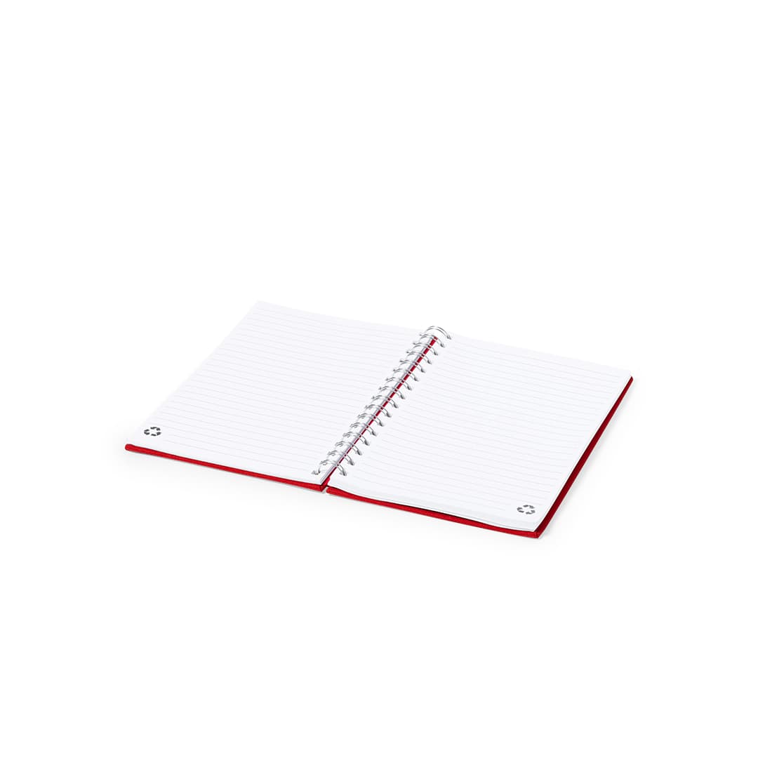Libreta de anillas A5 con tapas duras en resistente material RPET 300D. Interior con 100 hojas a una raya y 100% recicladas. Incluye distintivo RPET en contraportada. Presentado en bolsa individual reciclada.