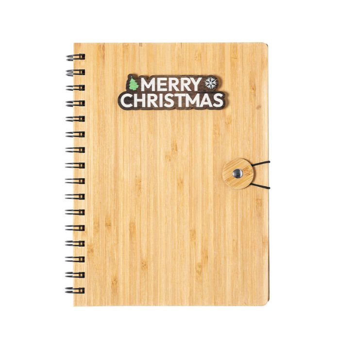 Libreta de bambú con diseño navideño, con un detalle de madera en la portada con las palabras “Merry Christmas”. Una libreta de anillas con tapas rígidas de bambú y original cierre elástico. Contiene 80 hojas, todas ellas ecológicas, hechas con papel reciclado, y con su distintivo eco correspondiente en cada página.
