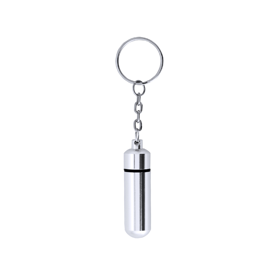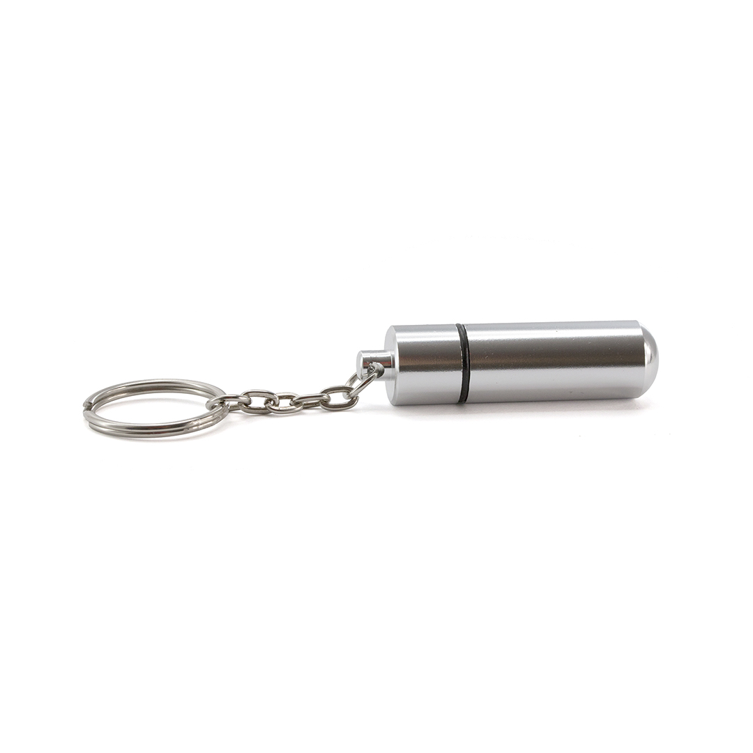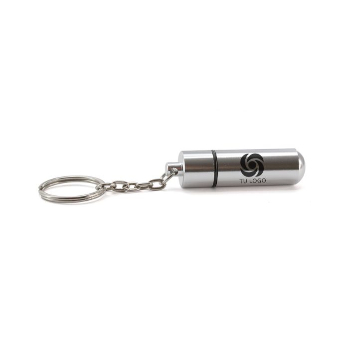 Llavero pastillero de aluminio, con acabado brillante y cierre a rosca, para tener tus pastillas siempre bien guardadas.