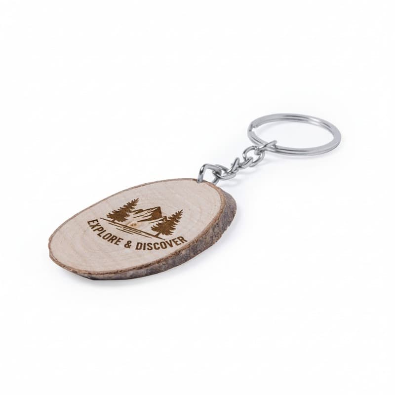 Elegante llavero de línea nature. Piezas obtenidas al corte de madera de haya, por lo que su textura, color y grosor pueden variar, convirtiéndolo así en una pieza única.Con amplia superficie de marcaje y disponible en diseños ovalado y redondeado.