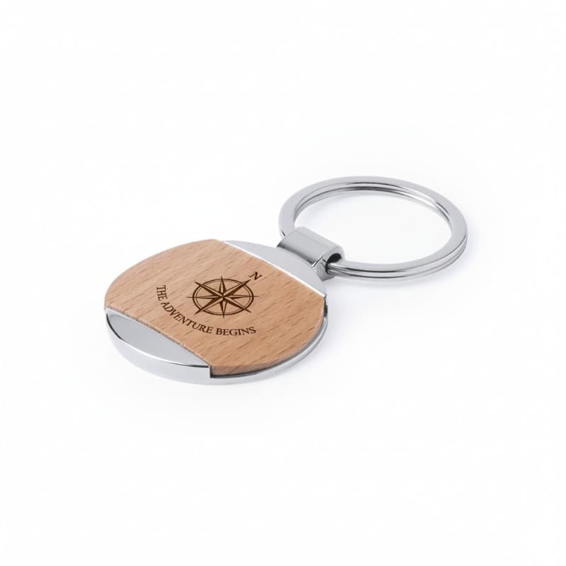 Llavero en combinación de materiales metal de acabado brillante y madera natural. Con amplia superficie para marcaje y presentado en bolsita con refuerzo de cartón en color plateado. Disponible en diseños circular y rectangular.