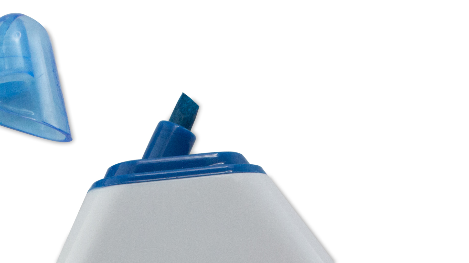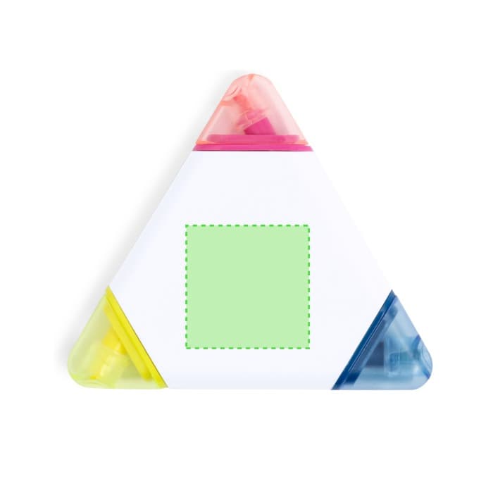 Original marcador fluorescente de tres colores con cuerpo triangular en suave acabado brillante de color blanco, especialmente diseñado para marcaje digital a todo color. Con capuchas translúcidas juego con marcador.