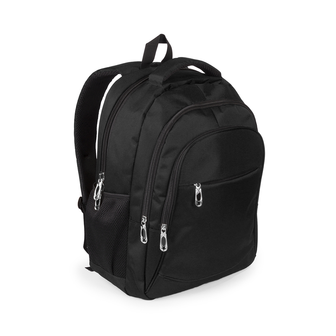 Mochila de resistente nylon 600D de sobrio diseño con cierre de cremallera, bolsillos frontales y asa reforzada doble. Con acolchado ergonómico en espalda y cintas de hombros, incluye compartimento interior acolchado para ordenador portátil de hasta 15 pulgadas.
