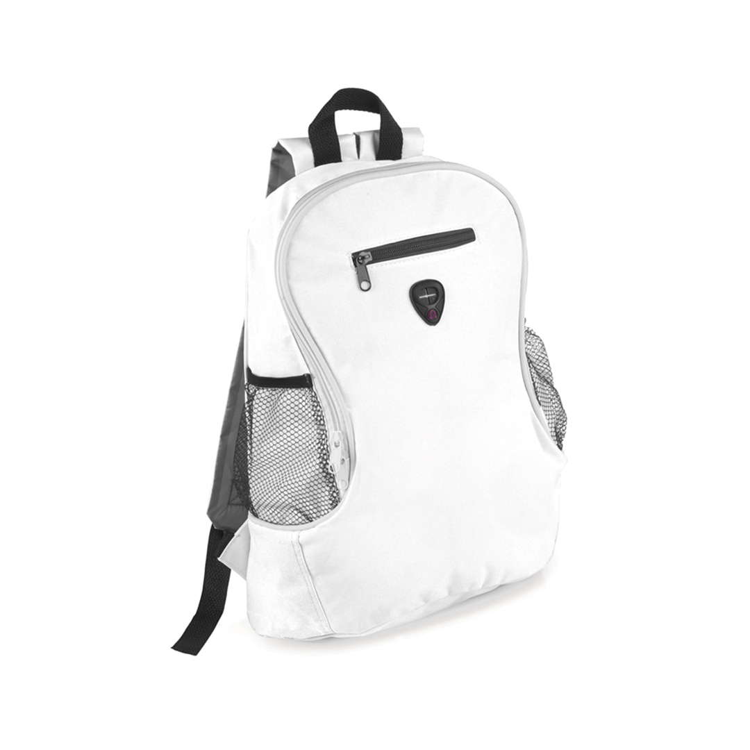Mochila en resistente poliéster 600D de desenfadado diseño, con cierre de cremallera, salida para auriculares, bolsillo frontal y bolsillos elásticos de redecilla a los lados. Accesorios en color negro, con cintas de hombros ajustables con acolchado.