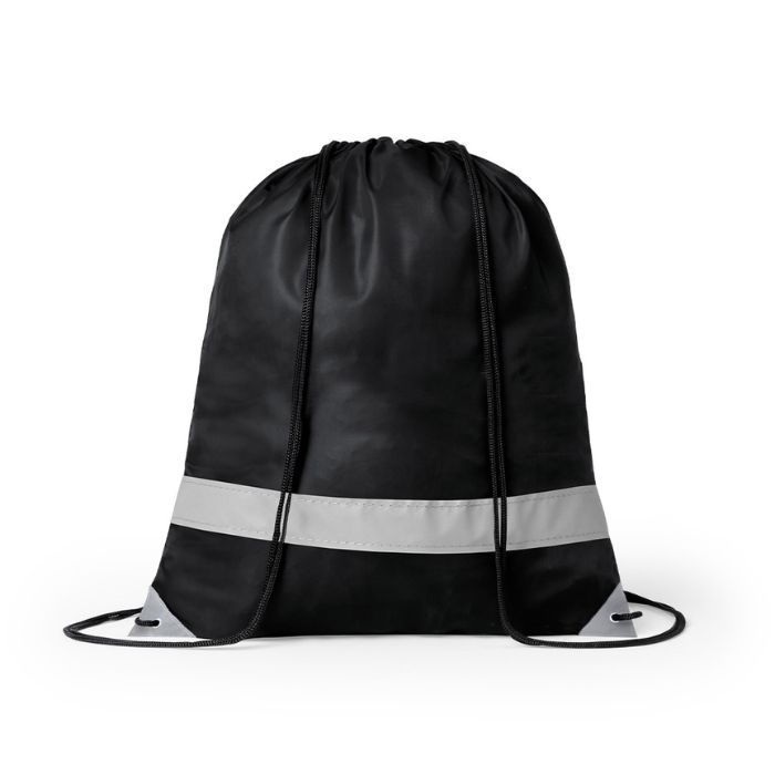 Mochila reflectante en suave poliéster 190T de alegres colores, con tira frontal reflectante. Cuerdas autocierre en color negro y esquinas reflectantes reforzadas con argollas metálicas.