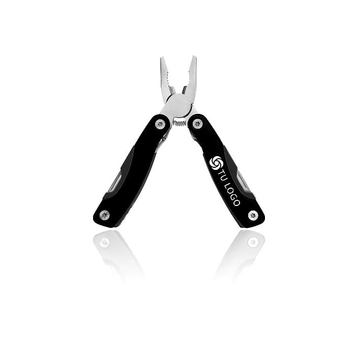Multiherramienta con resistente cuerpo en acero inox de 12 funciones. Incluye cuchillos y navajas, destornilladores, limas, abridores y alicates. En vivos colores y presentada en resistente funda de poliéster y caja individual.