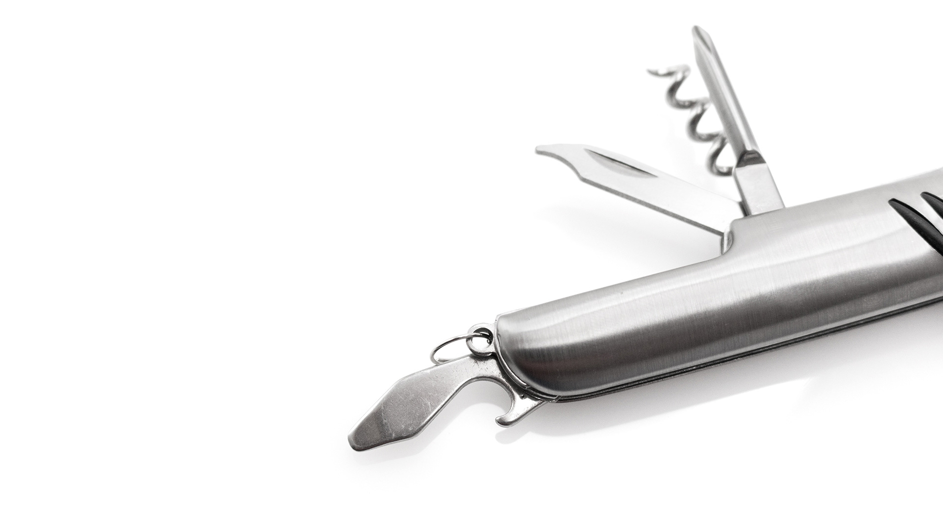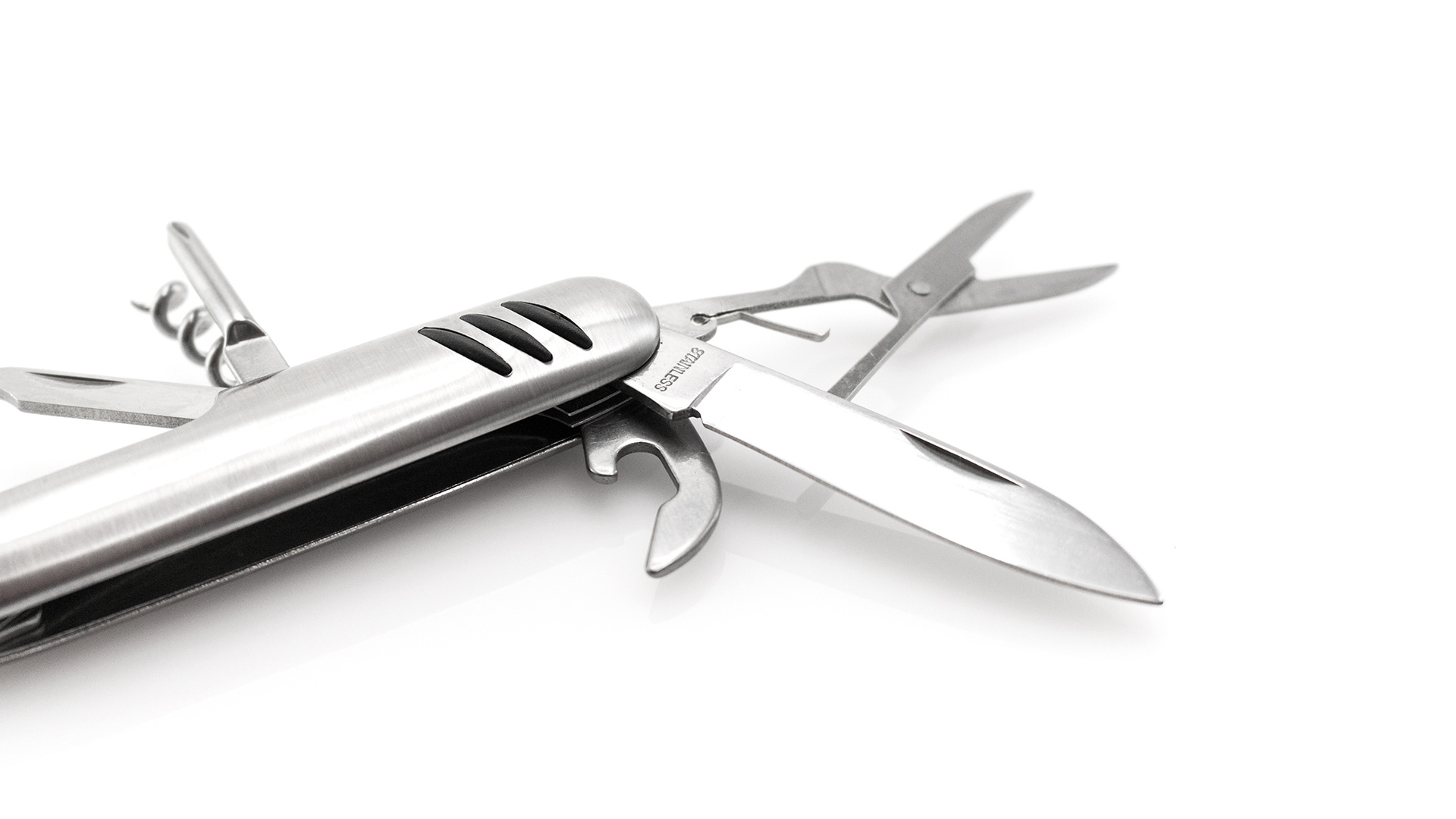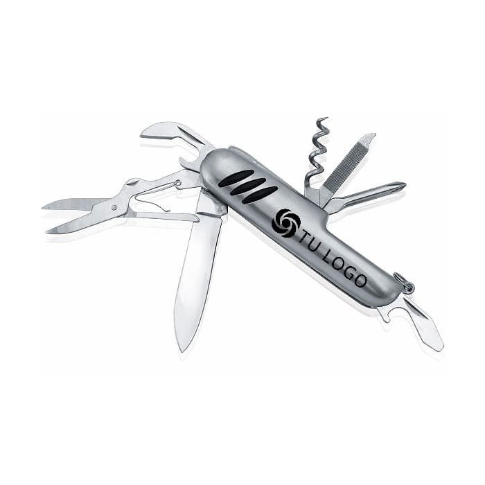 Navaja multiusos de acero inox de 10 funciones con empuñadura antideslizante. Incluye navaja, abridores, destornillador, lima, tijeras y anilla para llavero. Presentada en caja individual.