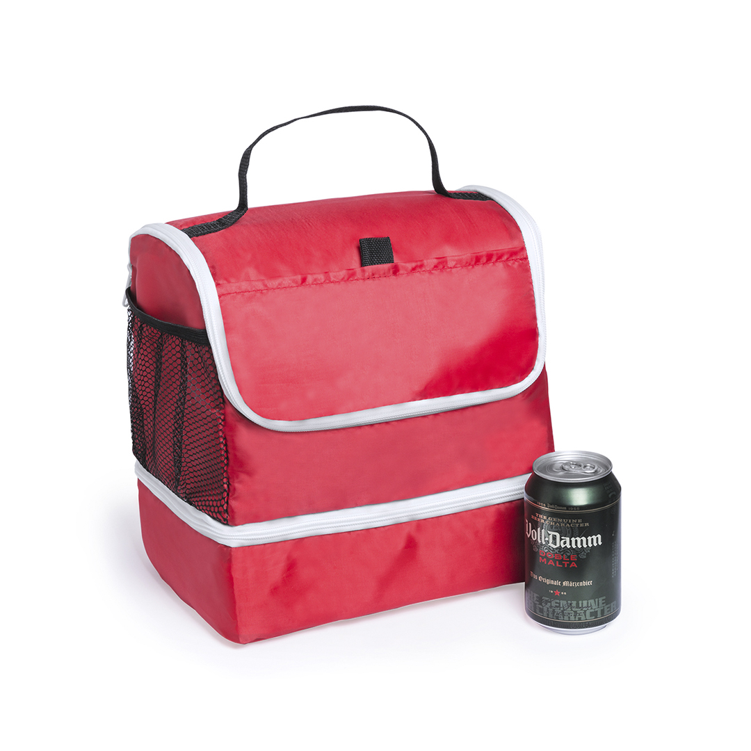 Nevera todoterreno en poliéster 210D de vivos colores y con dos compartimentos independientes con cierre de cremallera. Con bolsillo frontal de cierre de velcro y bolsillo de redecilla elástica en lateral. Interior isotermo en acabado PEVA. Con práctica asa de transporte en resistente nylon.