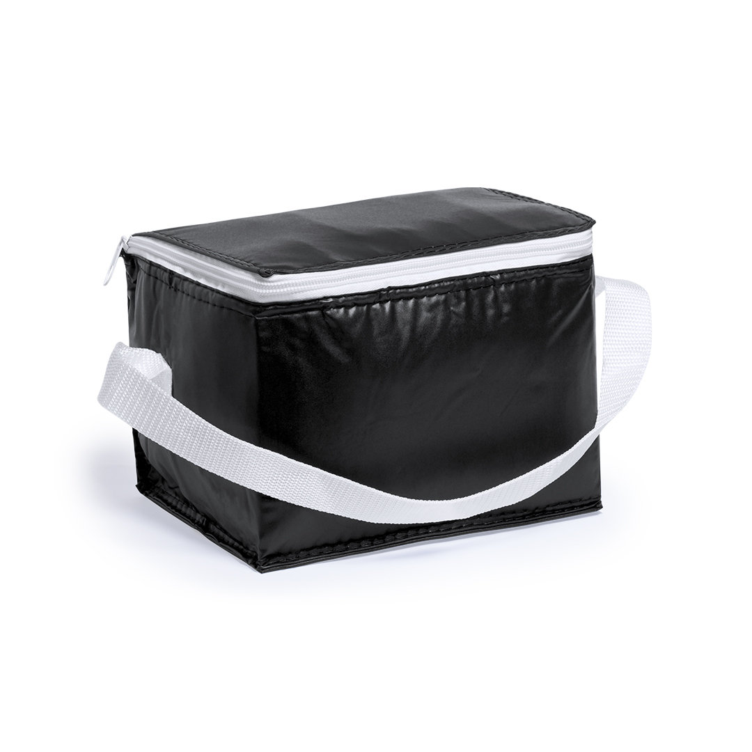 Nevera de 6 latas en resistente PVC de vivos colores. Interior isotermo en acabado de aluminio. Con cremallera y asa de transporte en color blanco a juego.