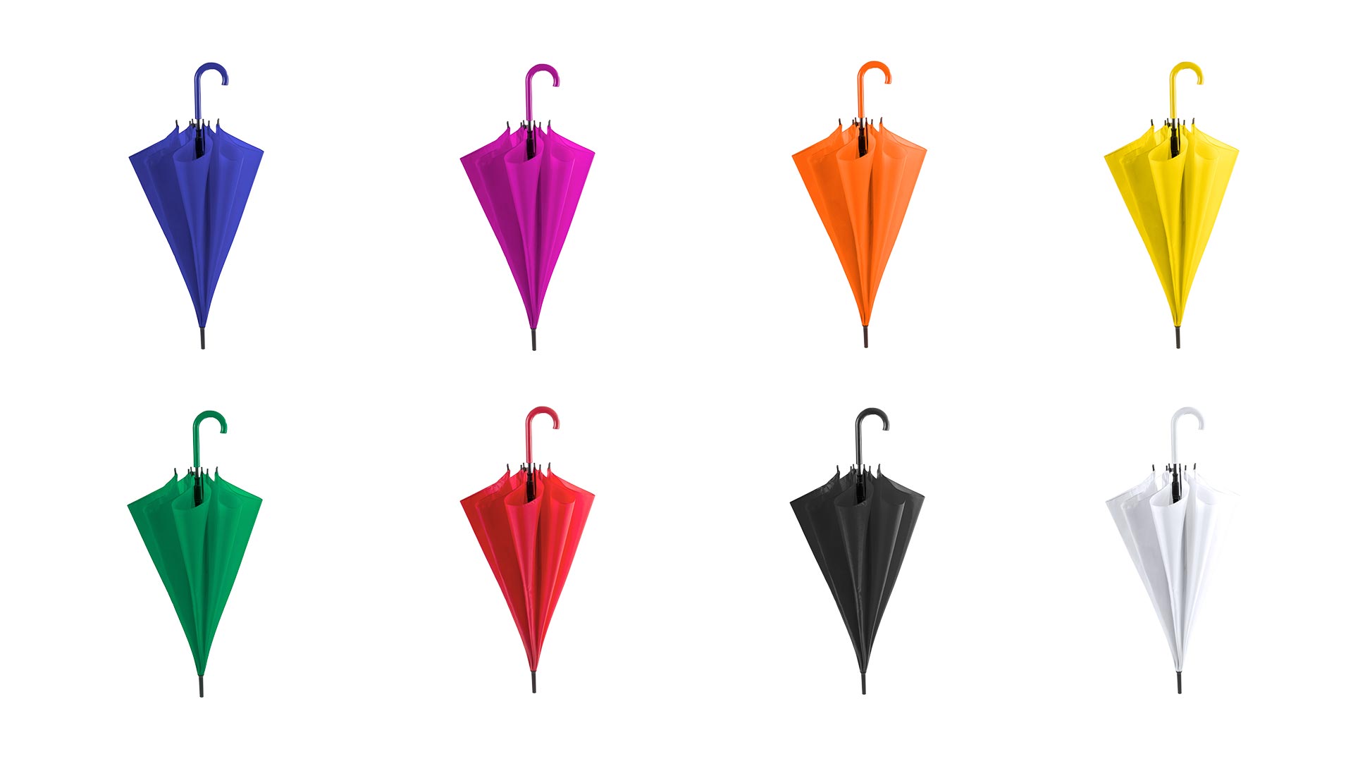 Paraguas de 8 paneles en extensa gama de vivos colores y 105cm de diámetro. De apertura automática, en resistente material poliéster, con varillas metálicas en color negro y mango a juego.
