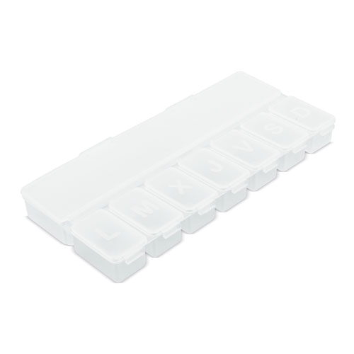 Pastillero con 7 compartimentos para guardar las pastillas de toda la semana, además de uno extra para poder tener una recarga. Con esta forma rectangular y plana, será perfecto para guardar en cualquier sitio, o tener a mano encima de la mesa, sin estorbar. Los 7 compartimentos para pastillas se encuentran distribuidos a un lado y en el otro un gran compartimento para guardar las recargas.