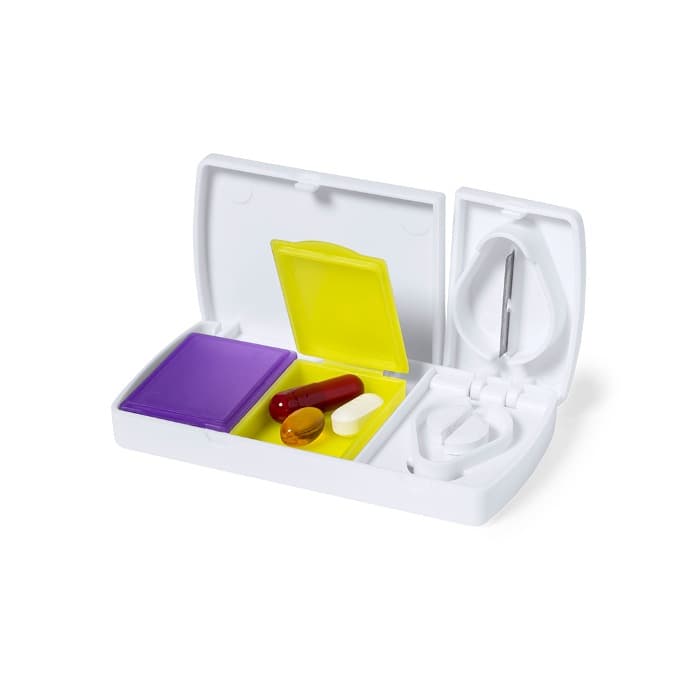 Pastillero en suave y resistente material acabado en color blanco. Cuenta con 2 cajitas interiores, cierre de seguridad y cuchilla para partir pastillas.