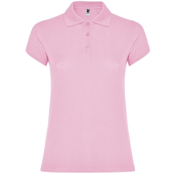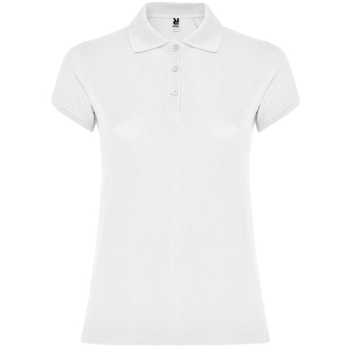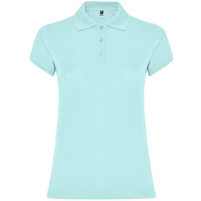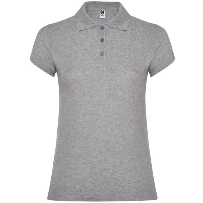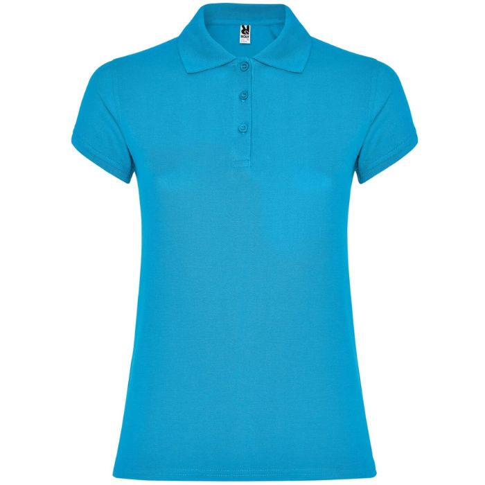 Polo de mujer de manga corta. Cubrecosturas reforzado en el interior del cuello. Cuello y ribete de manga acanalado. Costuras laterales y corte ajustado. Tapeta fina con tres botones. Aperturas en los laterales del bajo.