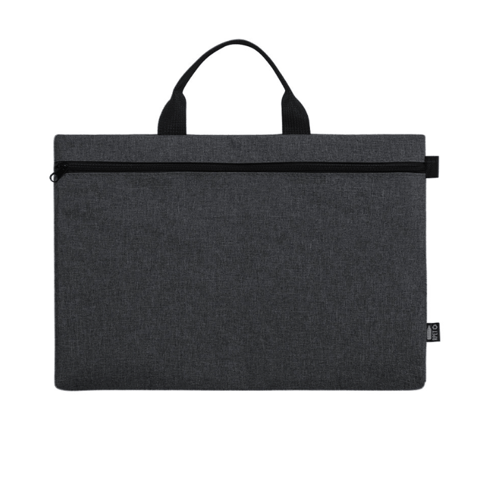 Portadocumentos de línea nature y en resistente 600D RPET efecto melange, elaborado a partir de plástico reciclado para así fomentar la reutilización de residuos plásticos y contribuir a la sostenibilidad del planeta. Detalles en negro y compartimento principal con cierre de cremallera. Resistentes asas a juego y distintivo RPET en etiqueta exterior.