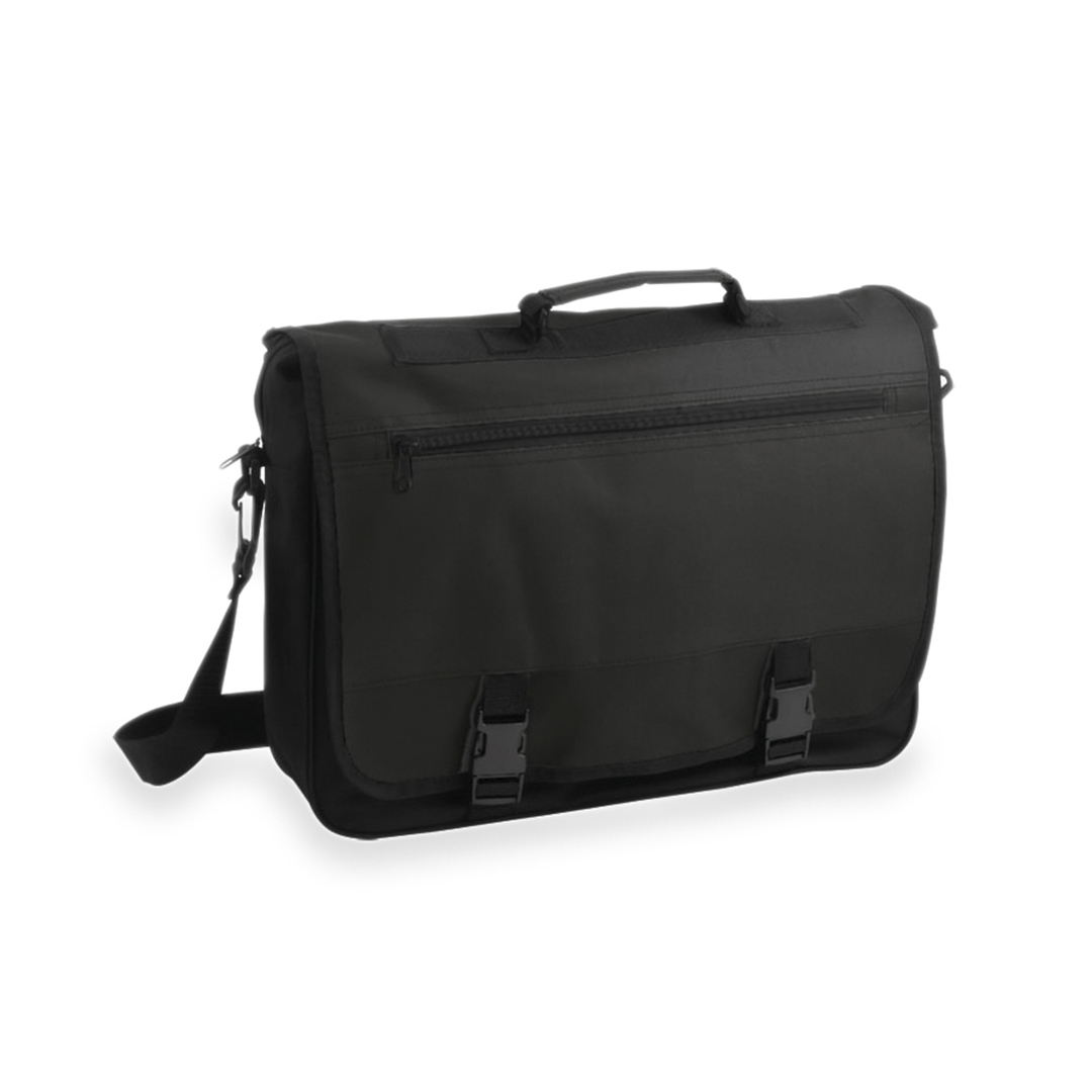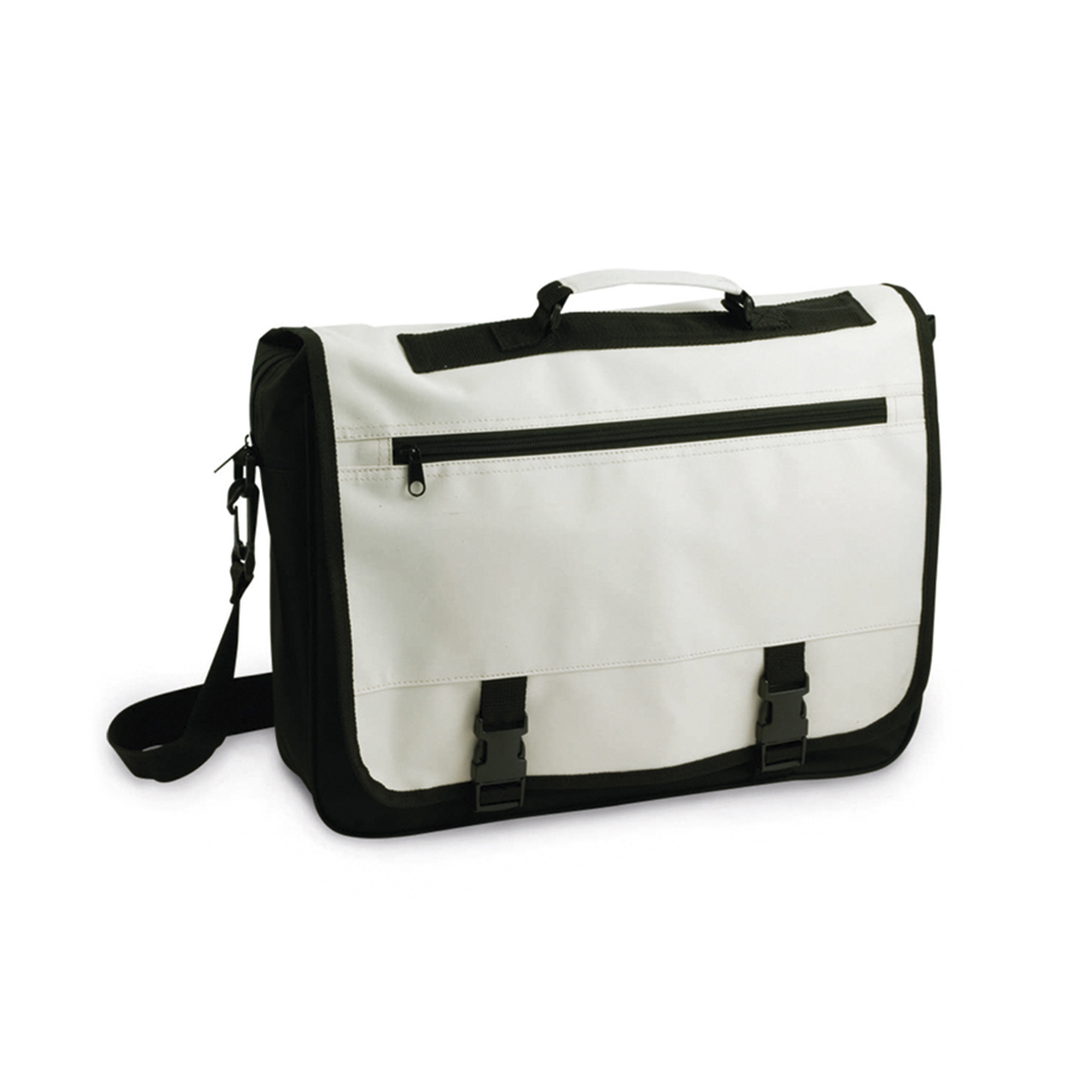 Portadocumentos con solapa de cierre de velcro en poliéster 600D con elegante tira frontal en color negro. Con asas de transporte reforzadas y cinta bandolera ajustable. Compartimentos interiores para bolígrafos y funda para smartphone en PVC con función táctil.