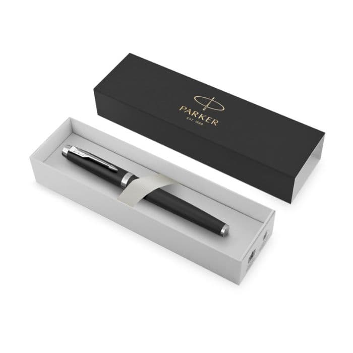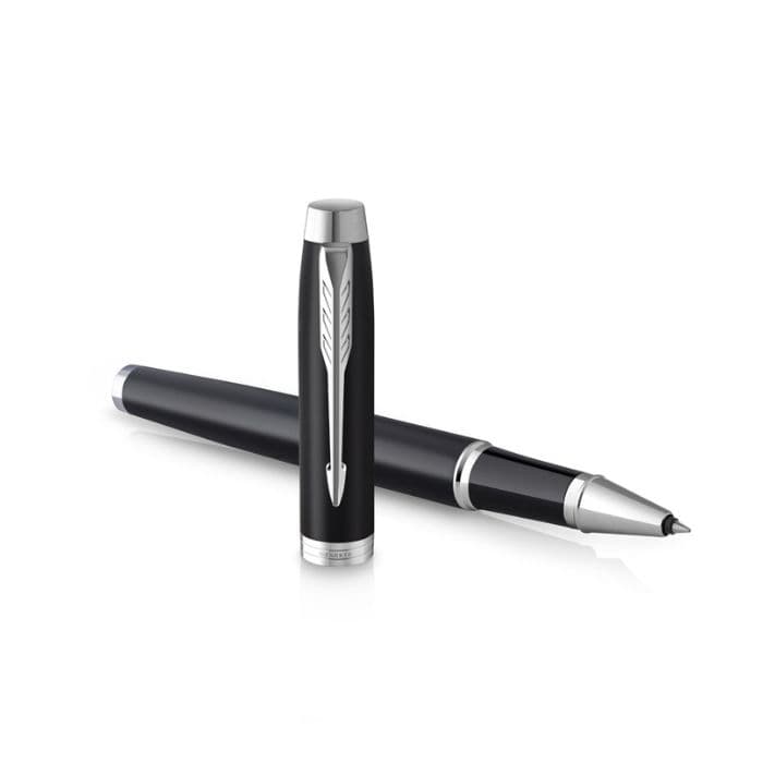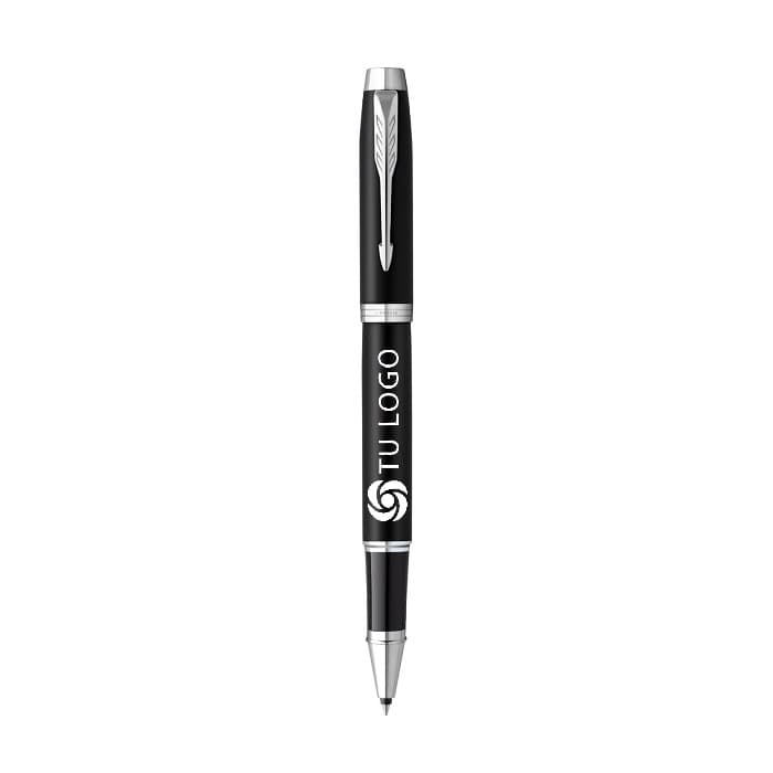 Te presentamos el Roller Parker IM Essential. Un bolígrafo roller con cuerpo y capuchón metálicos lacados en color negro mate y adornos cromados. Reconocible su famosa marca con ese clip en punta de flecha en la capucha.